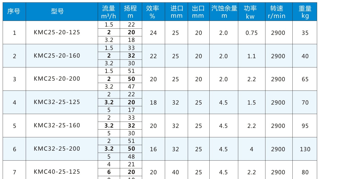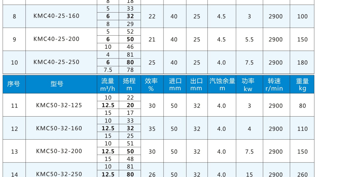 性能参数表:电机转速2900r/min,表中流量扬程加粗为额定参数: